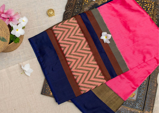 Ikat Silk Saree in Pink and Navy Blue