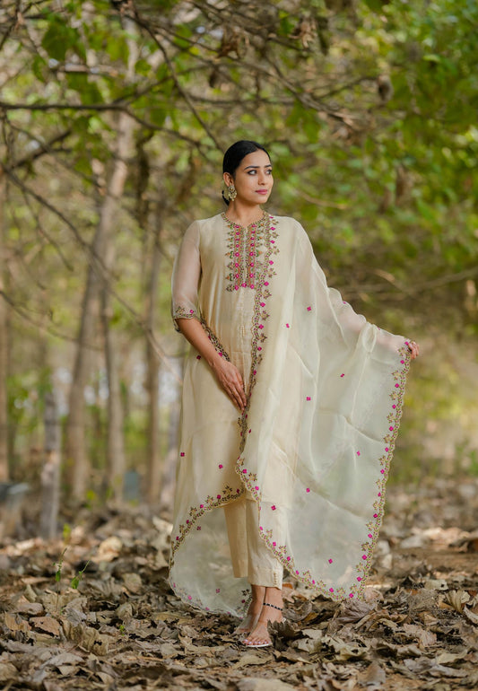 Women’s wear embroidered chanderi kurta set with organza dupatta beige