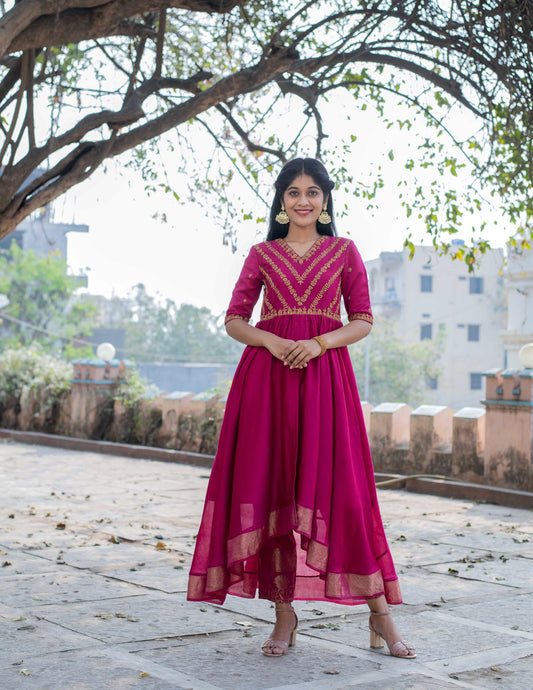 Hand Embroidered Zardosi Chanderi Hi-Low Kurta with Modal Bottom