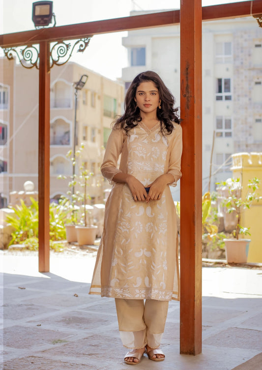 Hand Embroidered Chanderi Kurta and Bottom with Organza Detailing