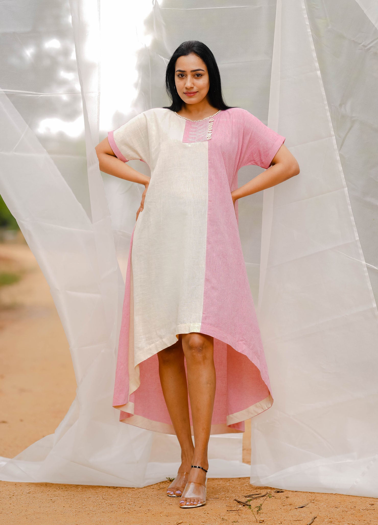 Elevate your wardrobe with this stunning white and pink high-low dress, featuring a flattering A-line cut that ensures comfort and style. The subtle embroidered details add a touch of elegance, making it perfect for any occasion.