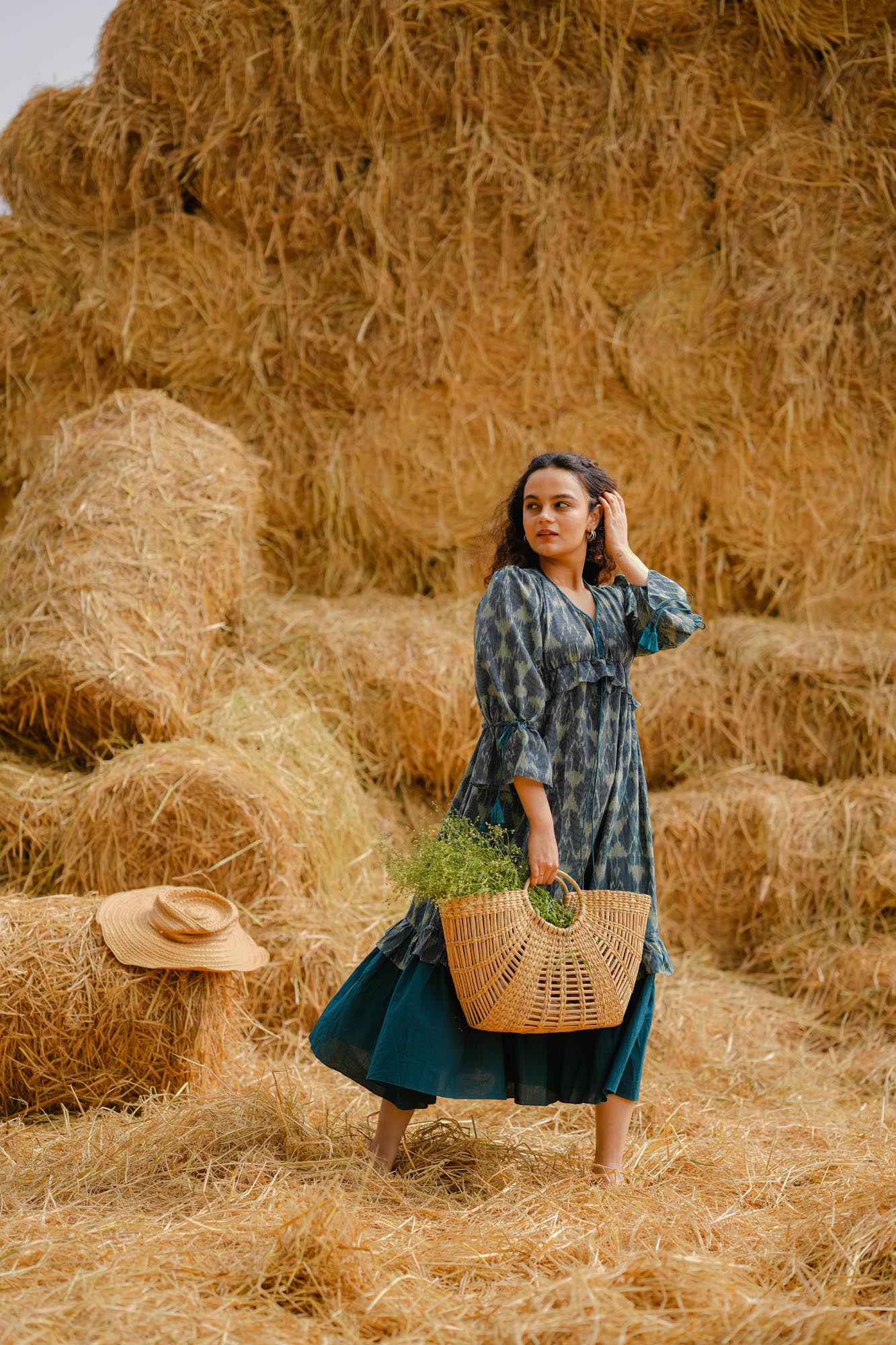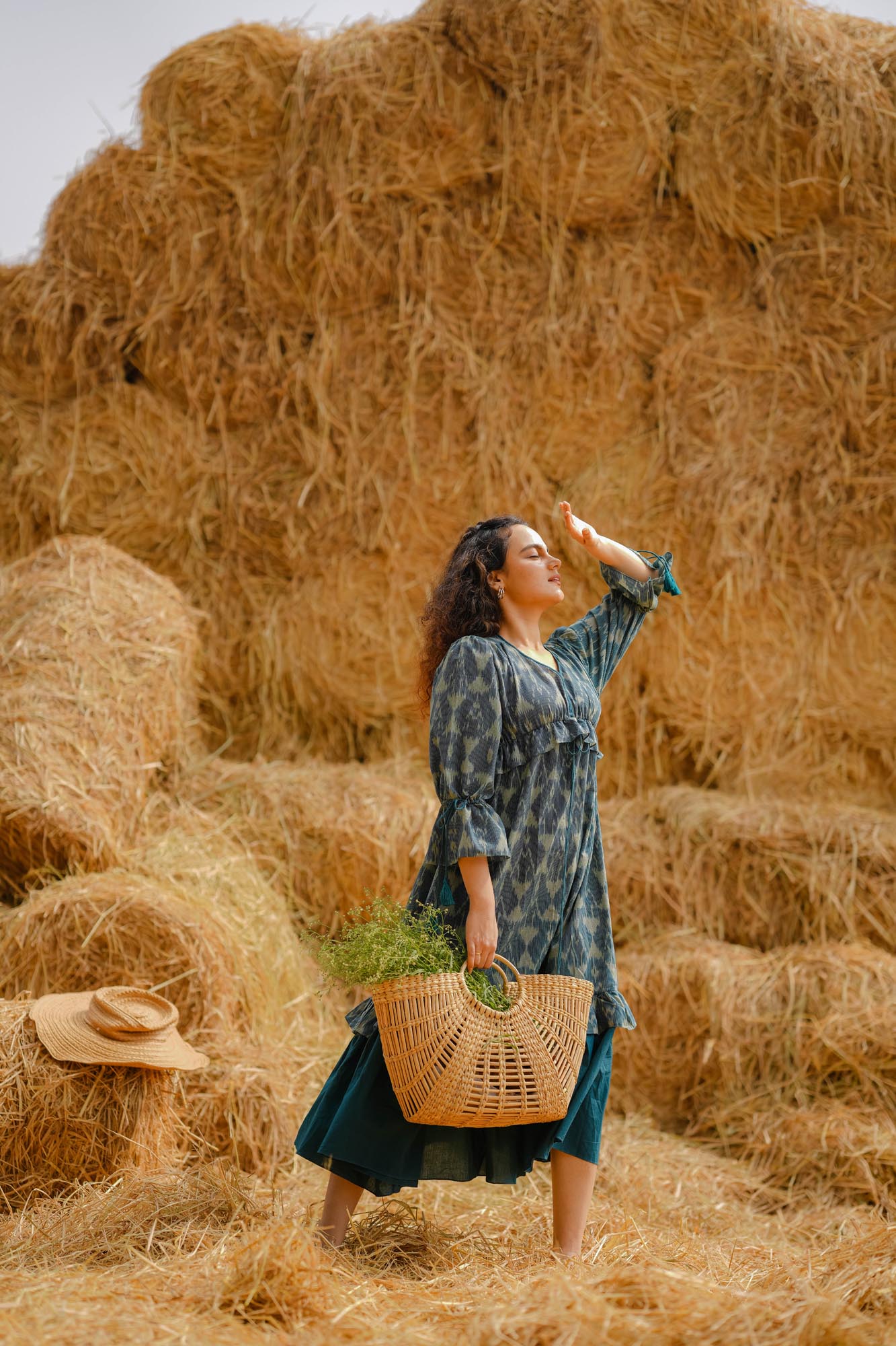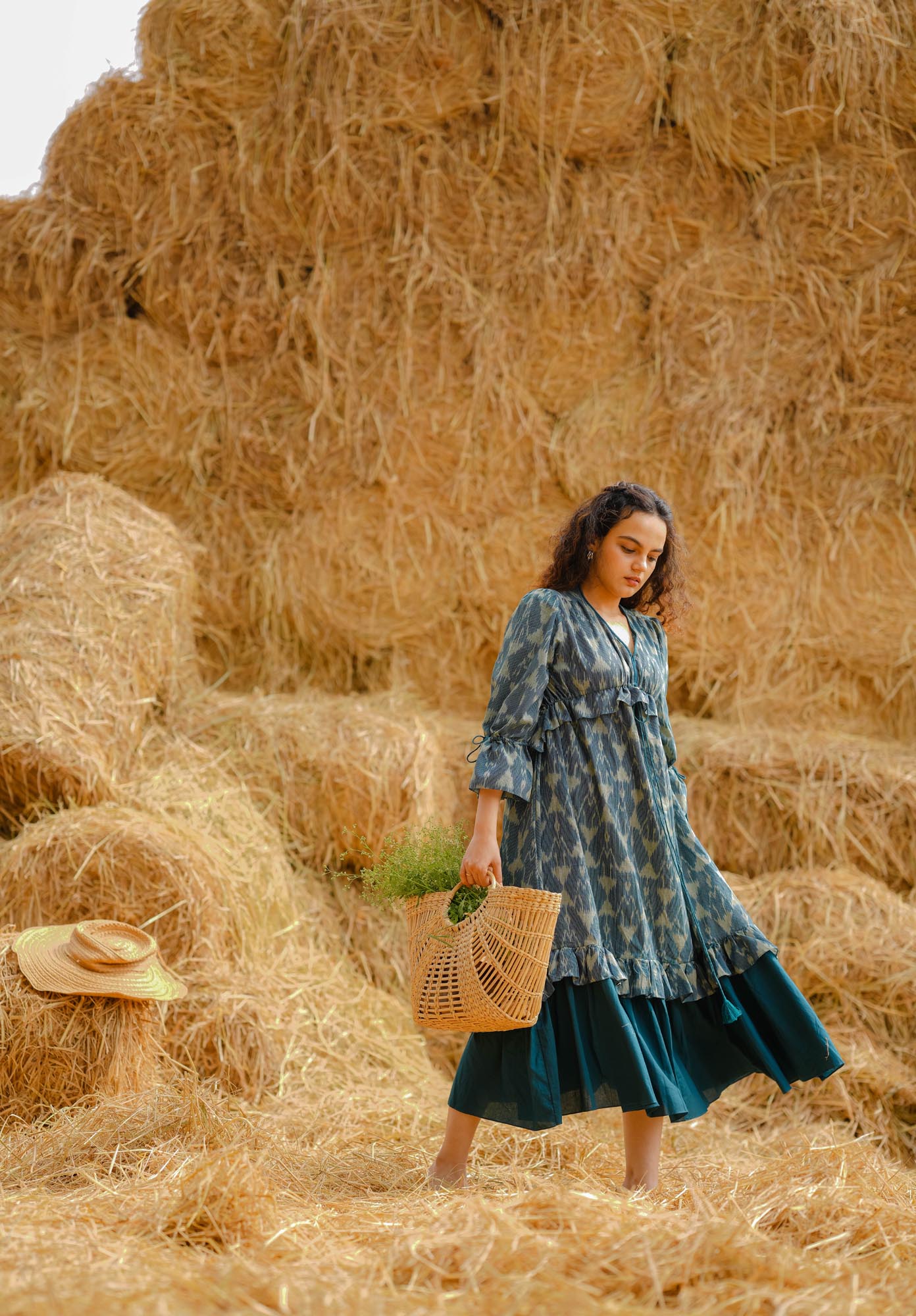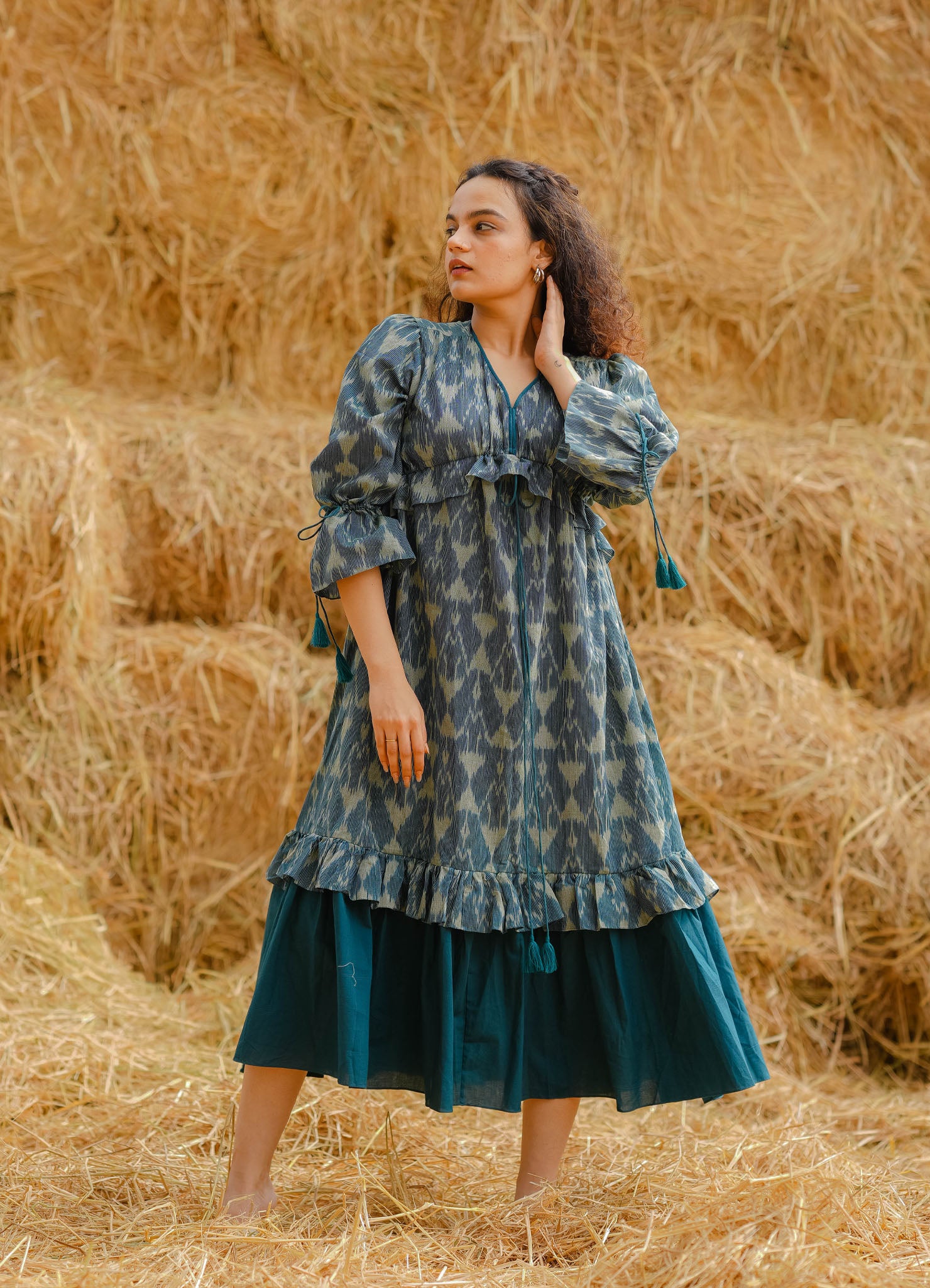 Crafted out of handloom ikat fabric this designer cotton casual dress is an easy silhouette with the right flare