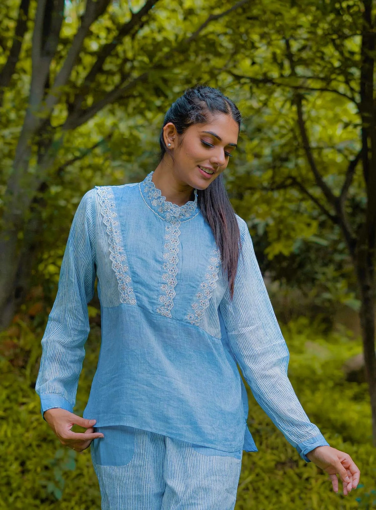 Light blue cotton tunic has a embroidered and lace details collar, front short placket button closure, blue and white stripes full lenght sleeves with cuff , straight hem and side slits