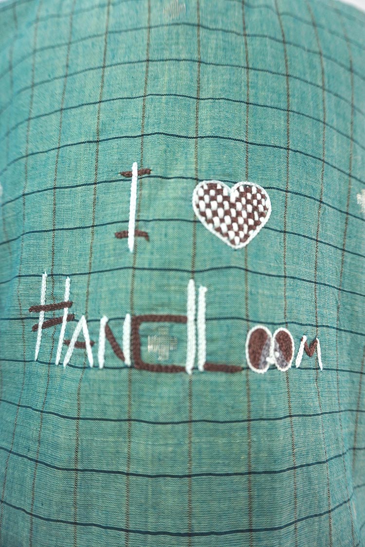 Forest green handwoven stripe jamdani back buttoned top with Hand embroidered details paired with plain cotton shorts.