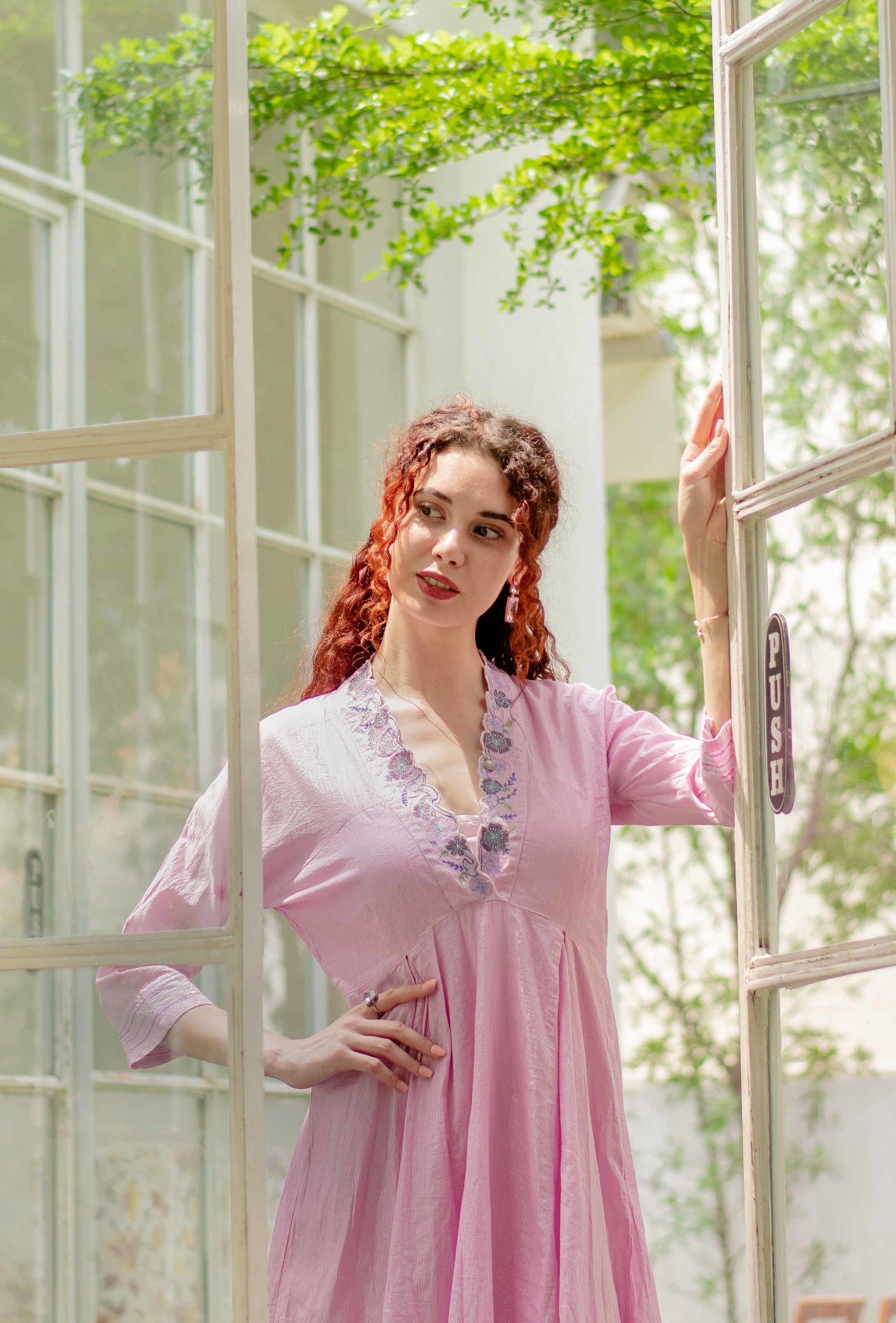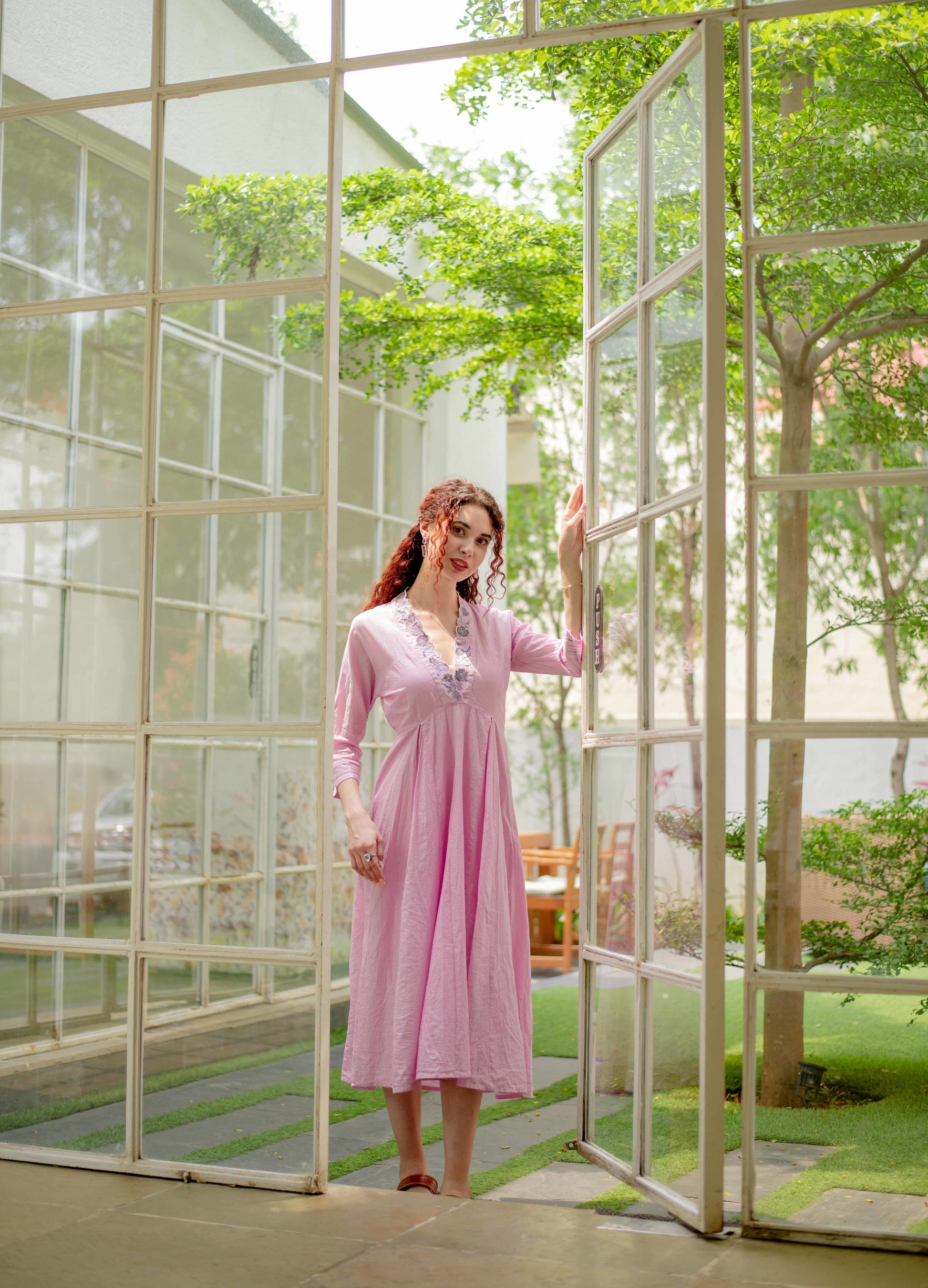Chic A Line lurex cotton dress with fine embroidery details on the neck.