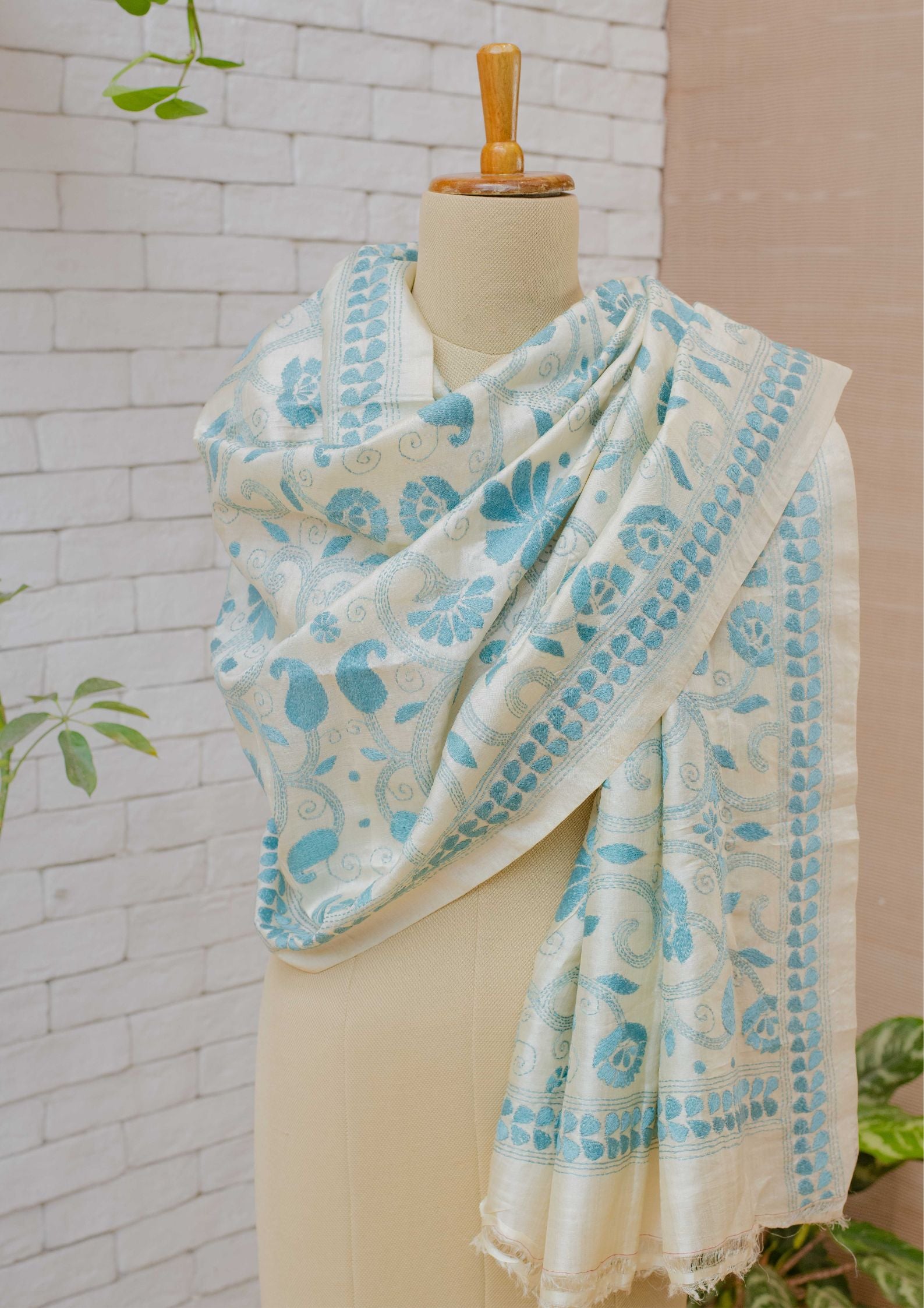 Hand embroidered traditional kantha work pure silk dupatta in white colour and blue thread work, which can style up your various looks.
