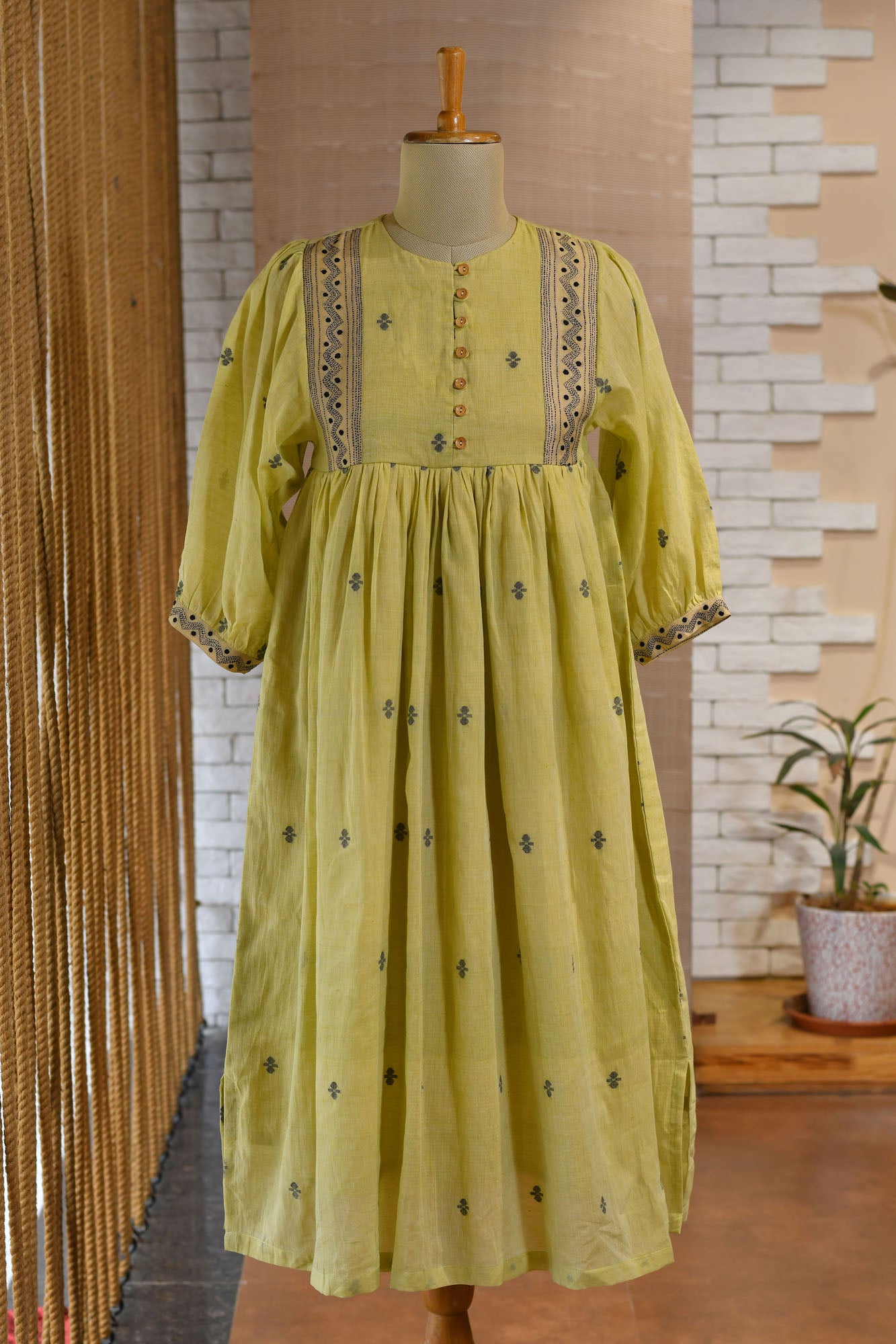 Handwoven jamdani gathered dress with kanta hand embroidered, has a collar neck and loop buttons details in the front, balloon sleeves, flared hem and side slit.