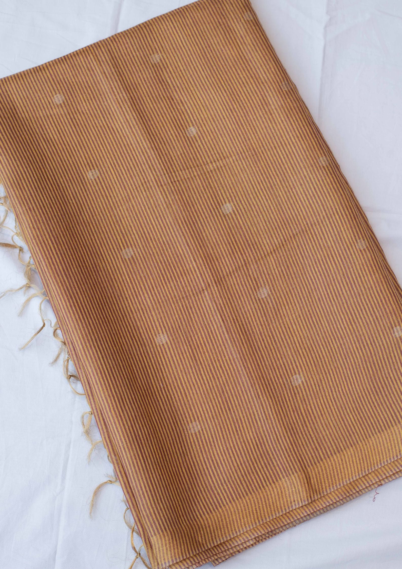 Handwoven Pure Tussar Silk Saree with gold zari stripe weaving on all over body of the saree. Saree has narrow gold zari woven border.