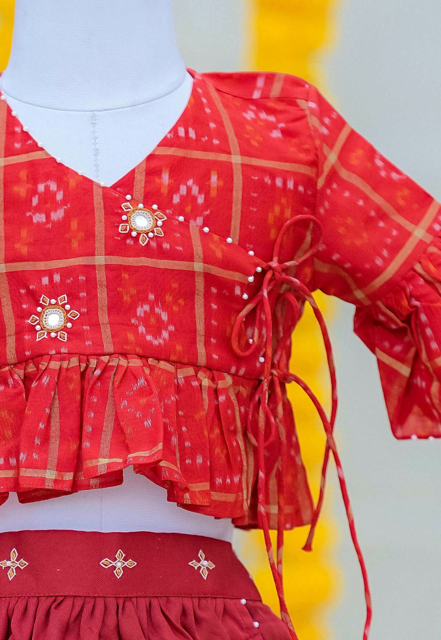 Pure silk Bandhani inspired Ikat crop top with mirror embroidery
