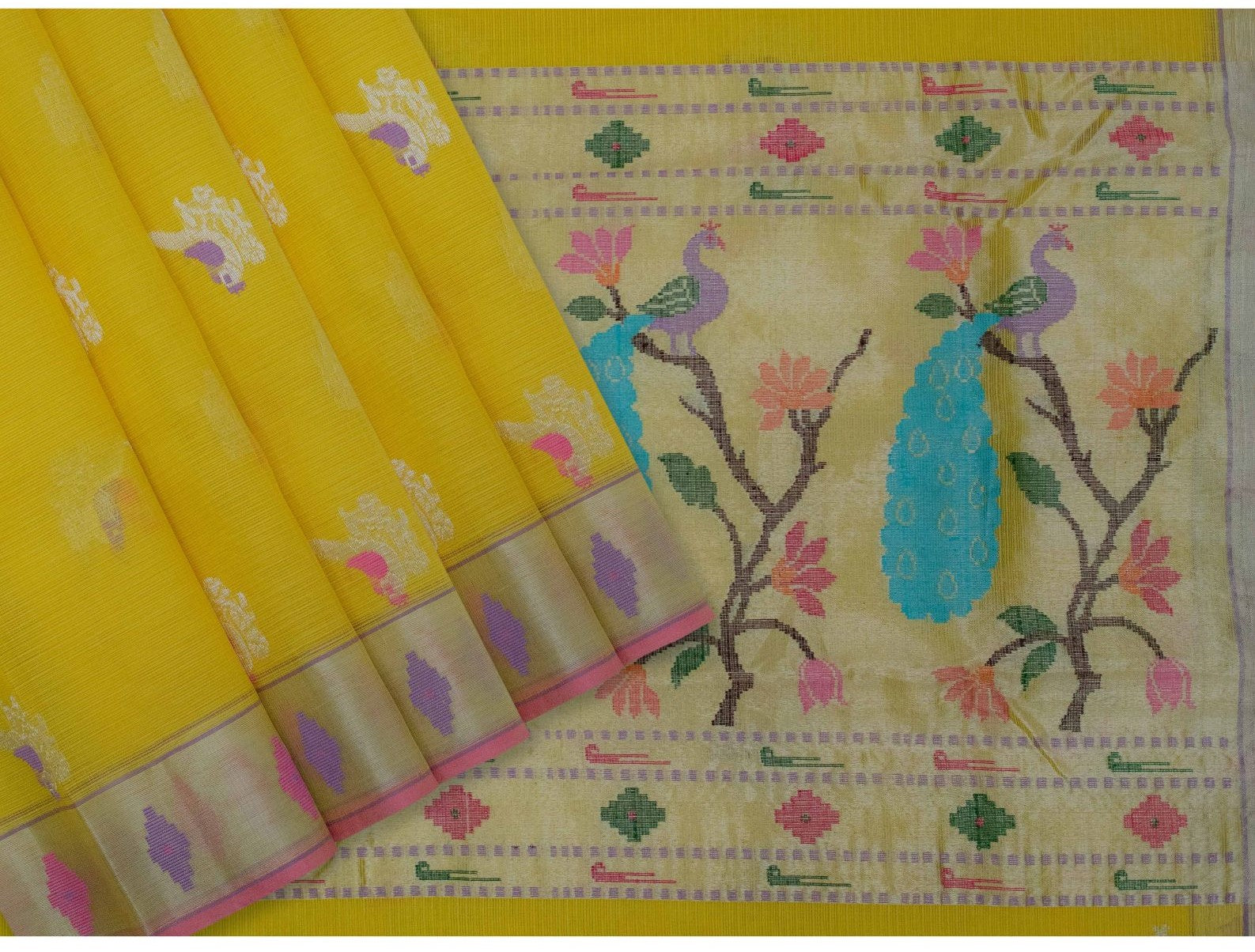 A radiant Pure silver Zari Tissue Kota saree - this masterpiece is luxurious, vibrant and timeless !!! This Yellow saree is inticately woven with breathtaking floral and bird's motifs & this is stunning display of Indian Handloom artisan's. Body of the saree is richly woven with all over parrot motif and pallu is beautifully designed and woven showing peacock seating on tree branch, gives you rich look for any grand occasion.